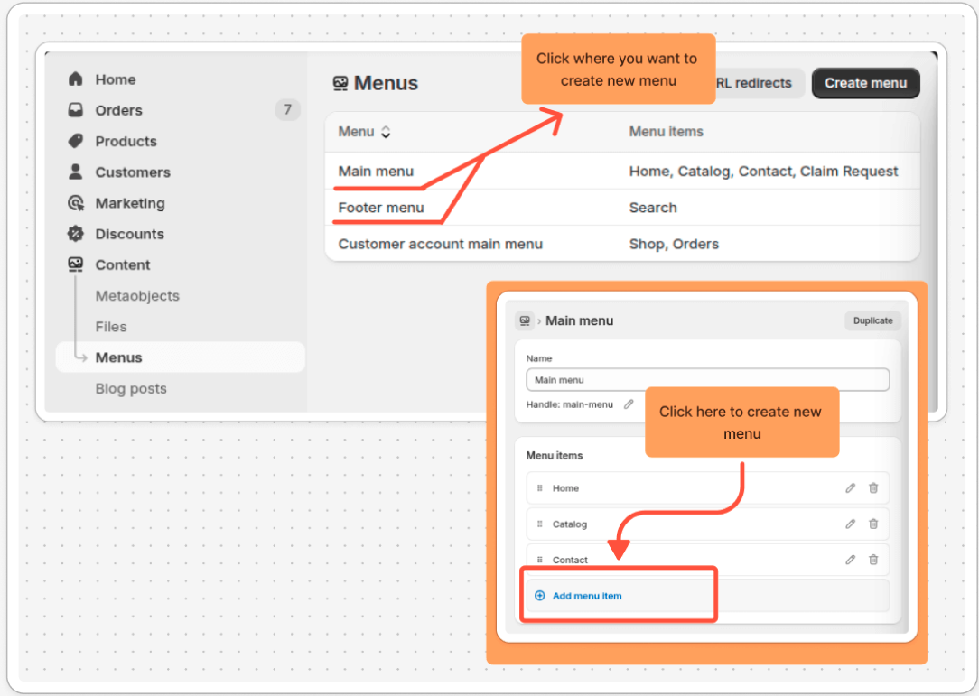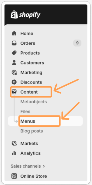 In your Shopify admin, go to Admin Navigation > Content > Menus.